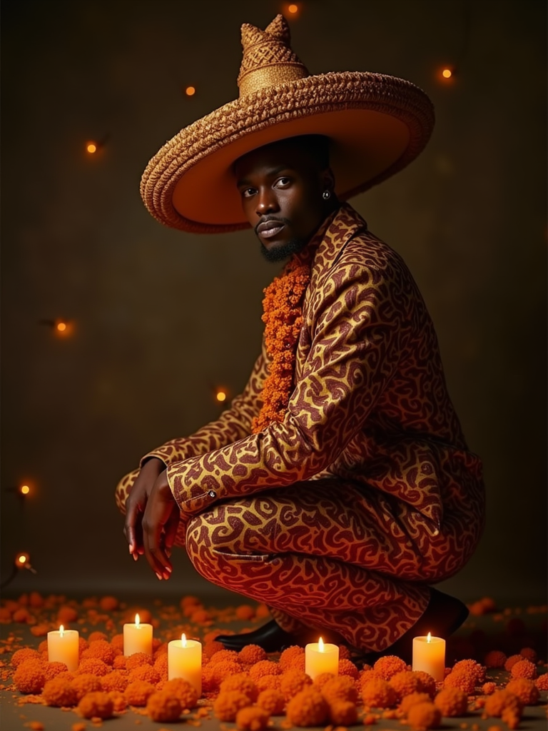 a model in an elegant Catrín outfit with traditional hat, striking a pose with beautiful marigold petals and candlelight casting warm patterns