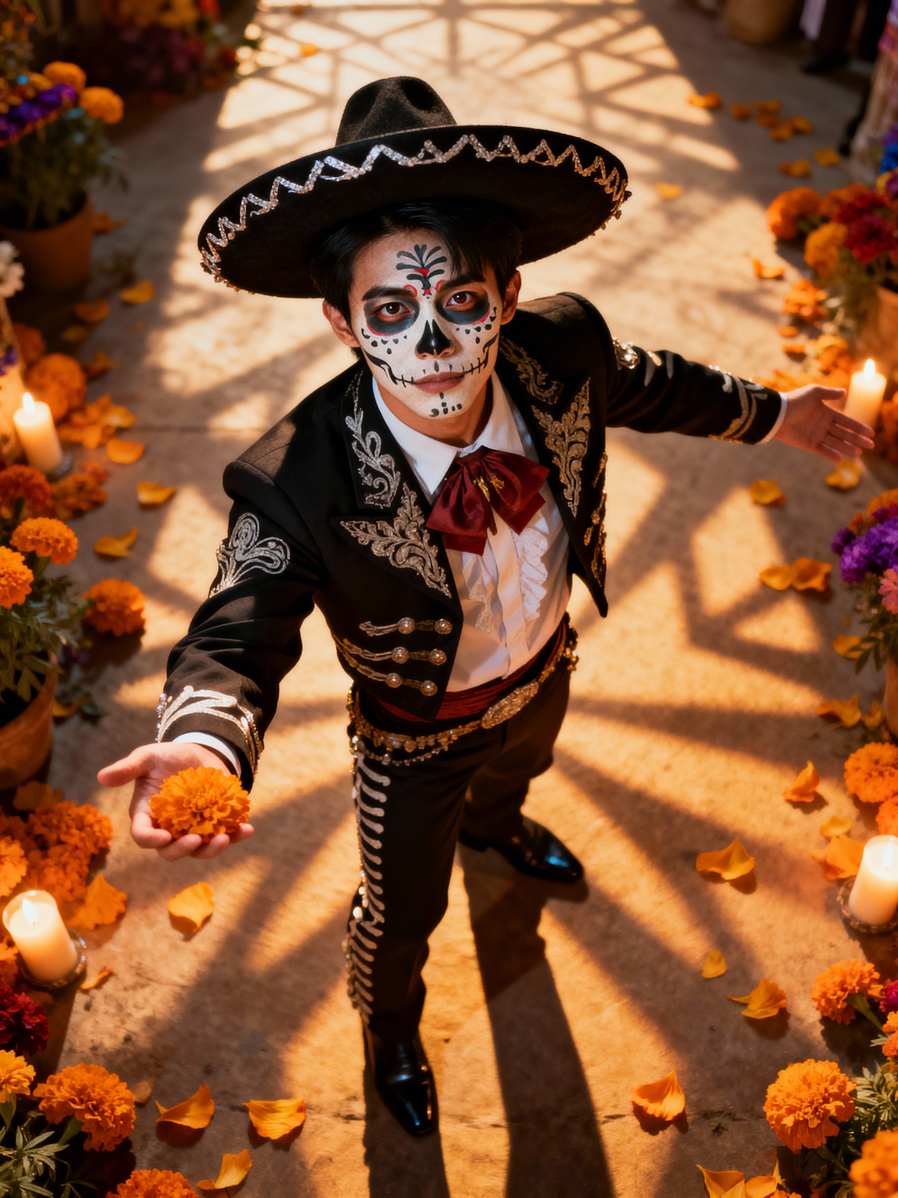 a model in an elegant Catrín outfit with traditional hat, striking a pose with beautiful marigold petals and candlelight casting warm patterns