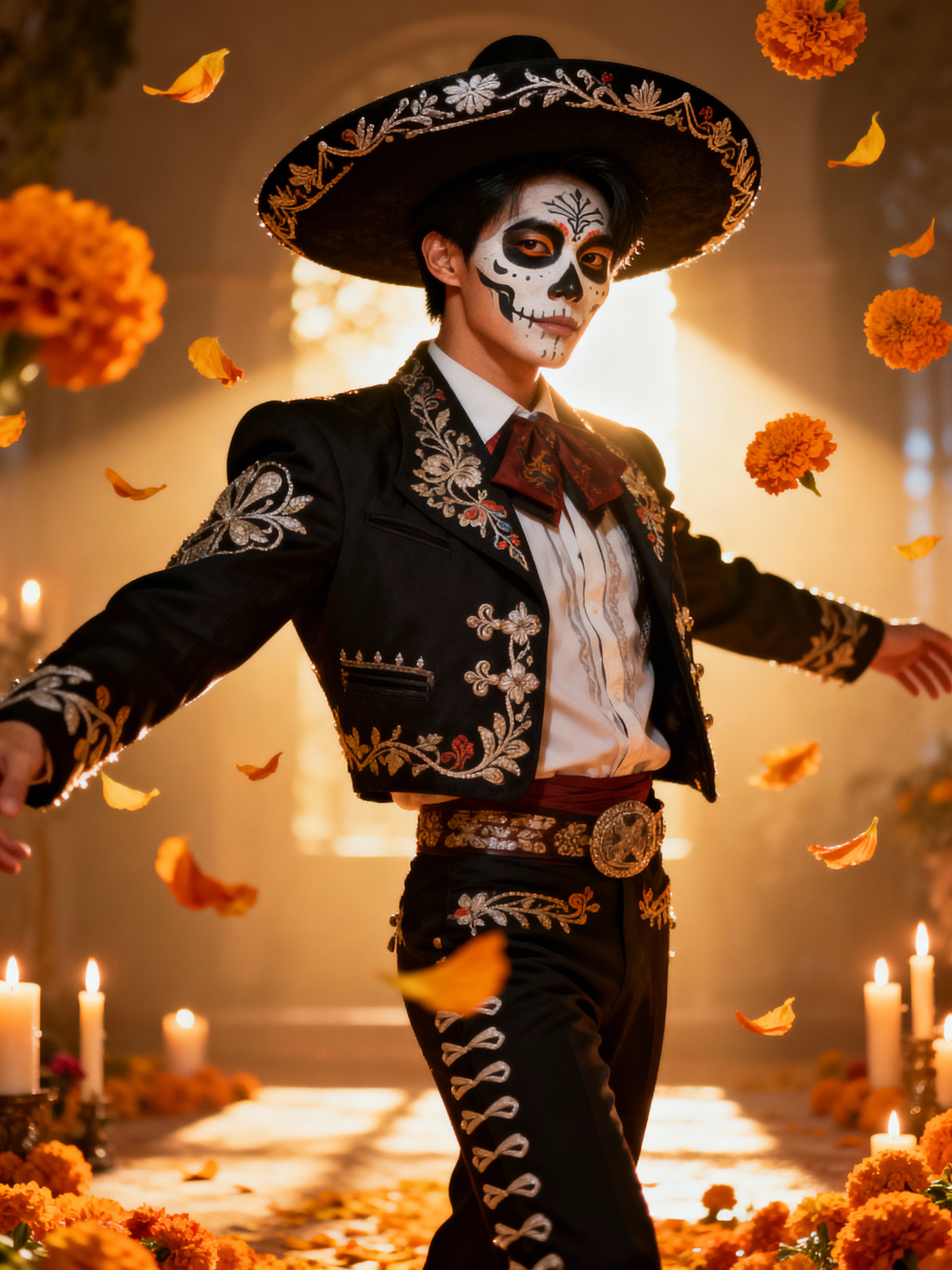 a model in an elegant Catrín outfit with traditional hat, striking a pose with beautiful marigold petals and candlelight casting warm patterns