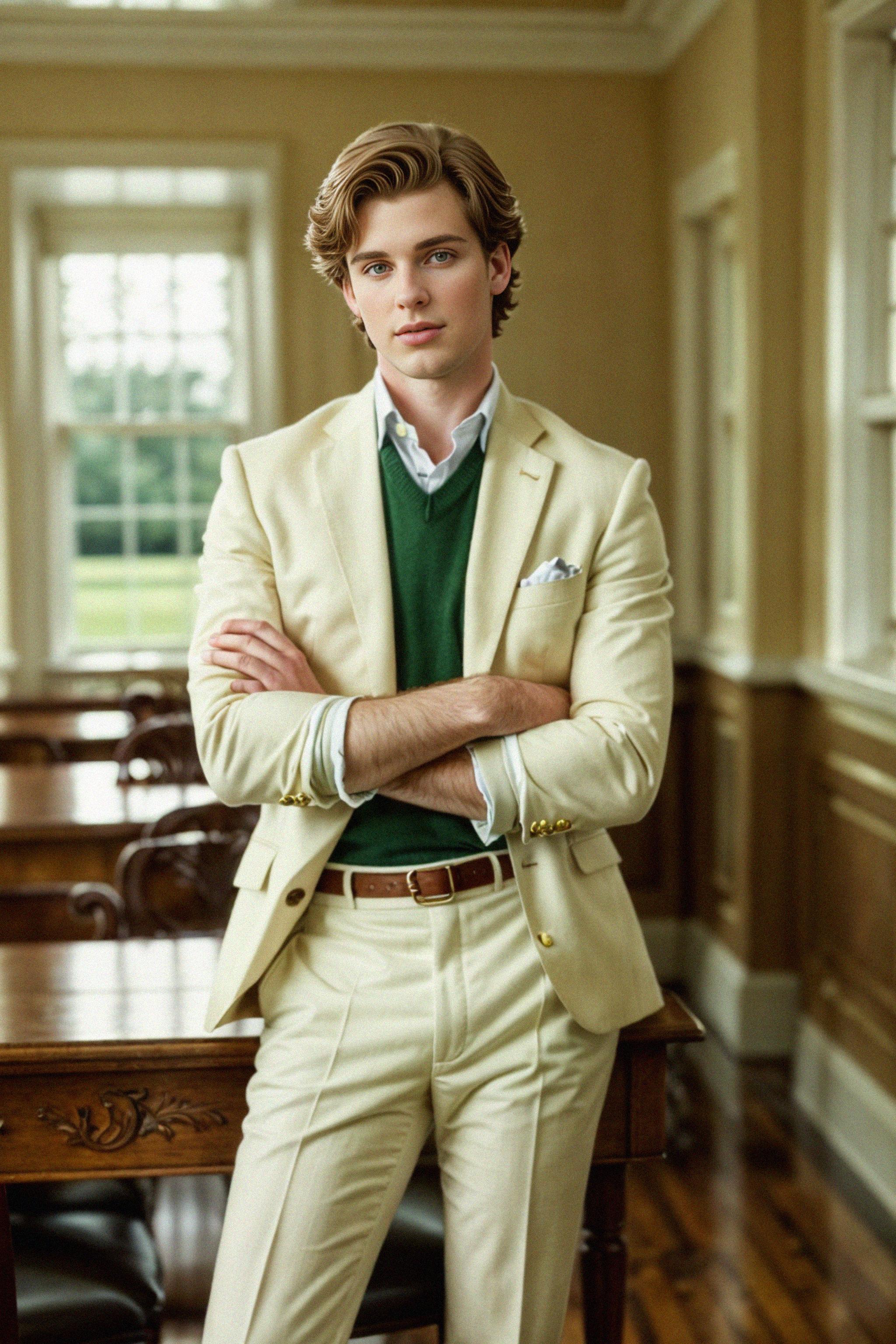 a model in preppy style, old money aesthetic, posh style, elite school stlye, luxurious style, gossip girl neo-prep style, ralph lauren style, country club style, ivy league style