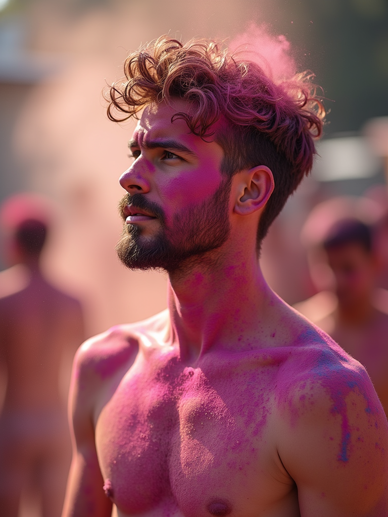 a model in simple clothes now completely transformed by festival powders, embodying the playful culture of Holi where everyone becomes a canvas
