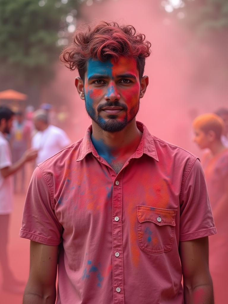a model in simple clothes now completely transformed by festival powders, embodying the playful culture of Holi where everyone becomes a canvas