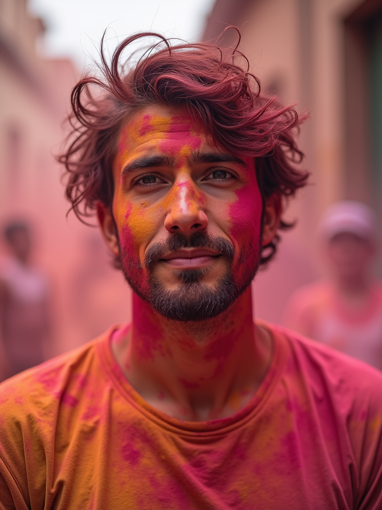 a model in simple clothes now completely transformed by festival powders, embodying the playful culture of Holi where everyone becomes a canvas
