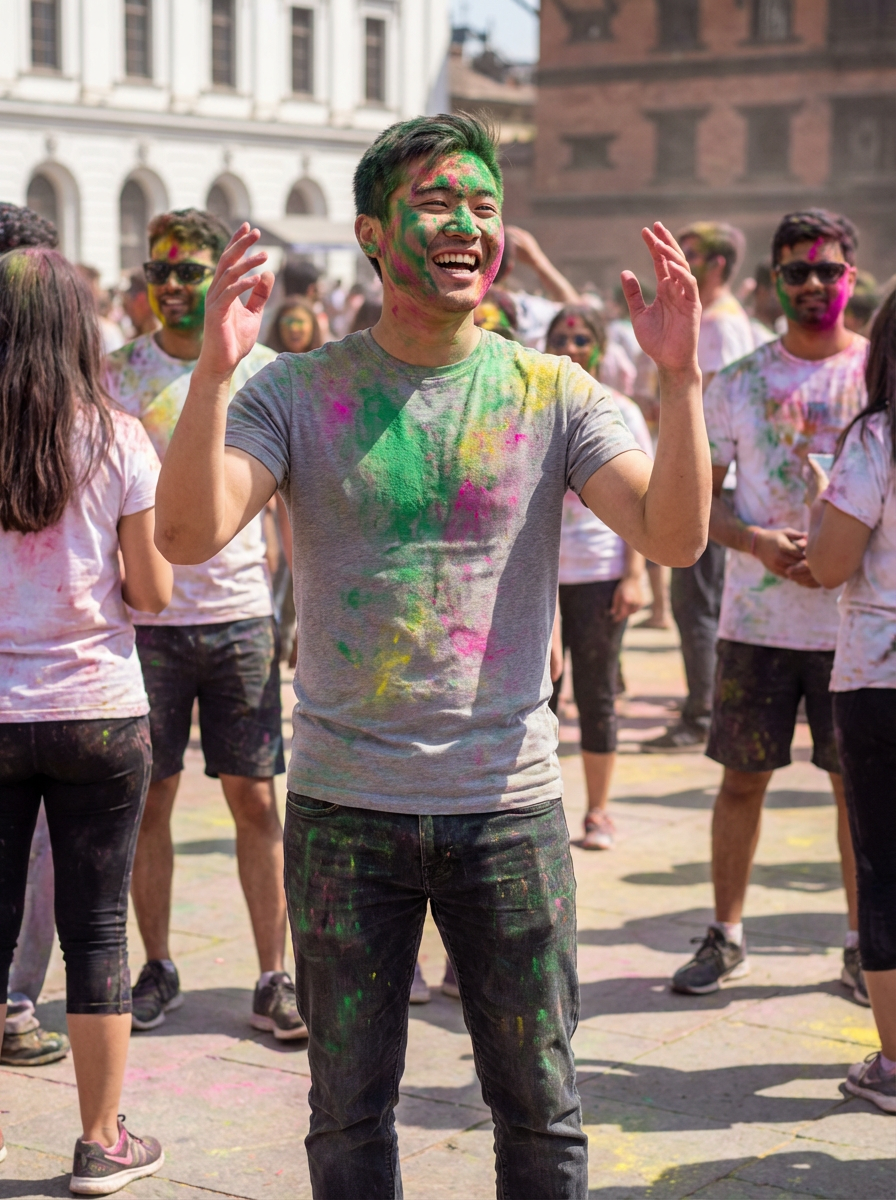 a model in simple clothes now completely transformed by festival powders, embodying the playful culture of Holi where everyone becomes a canvas