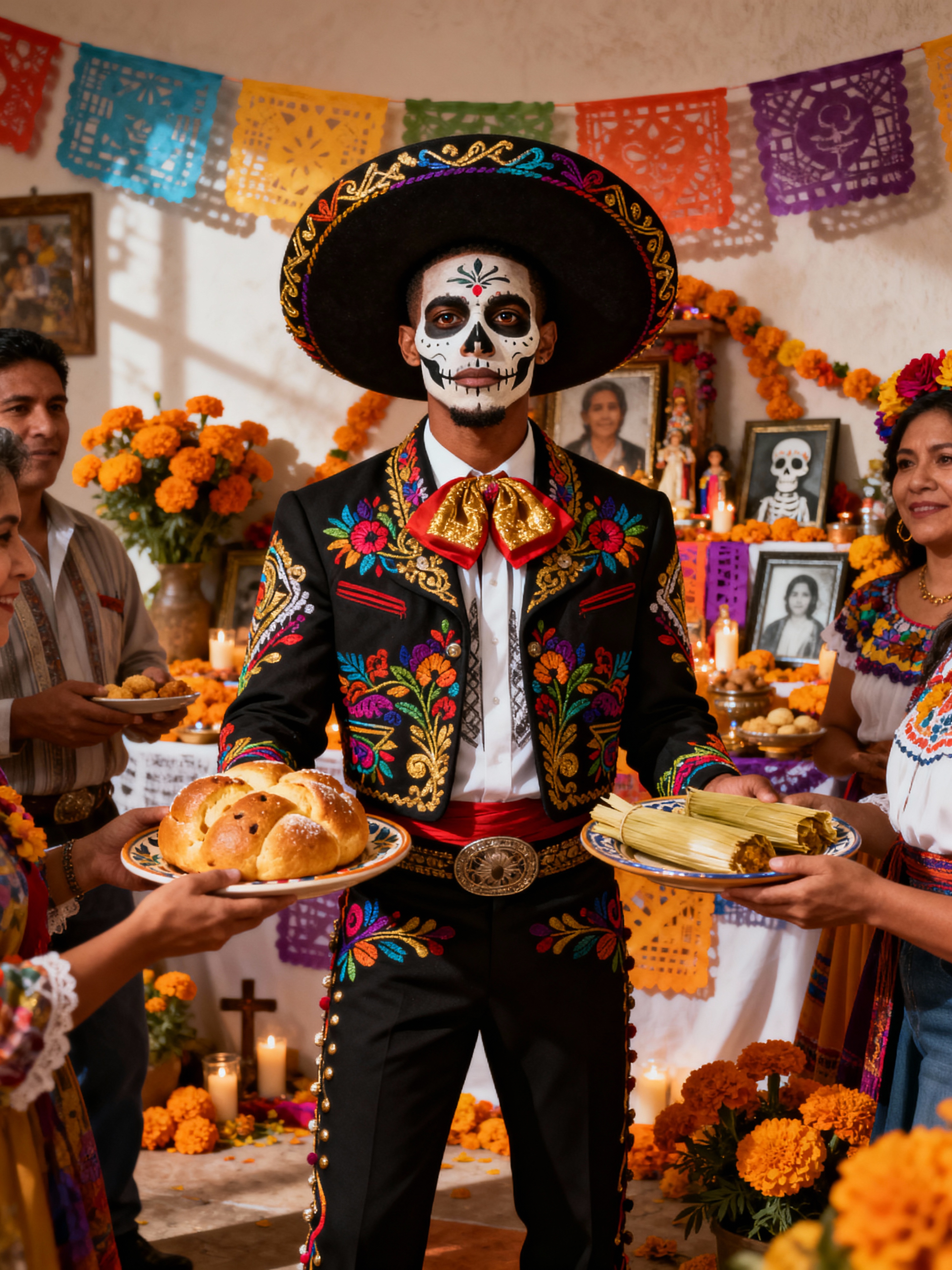 a model in traditional attire during Día de los Muertos, sharing traditional Mexican treats with guests, capturing the celebratory and family-oriented spirit of honoring ancestors