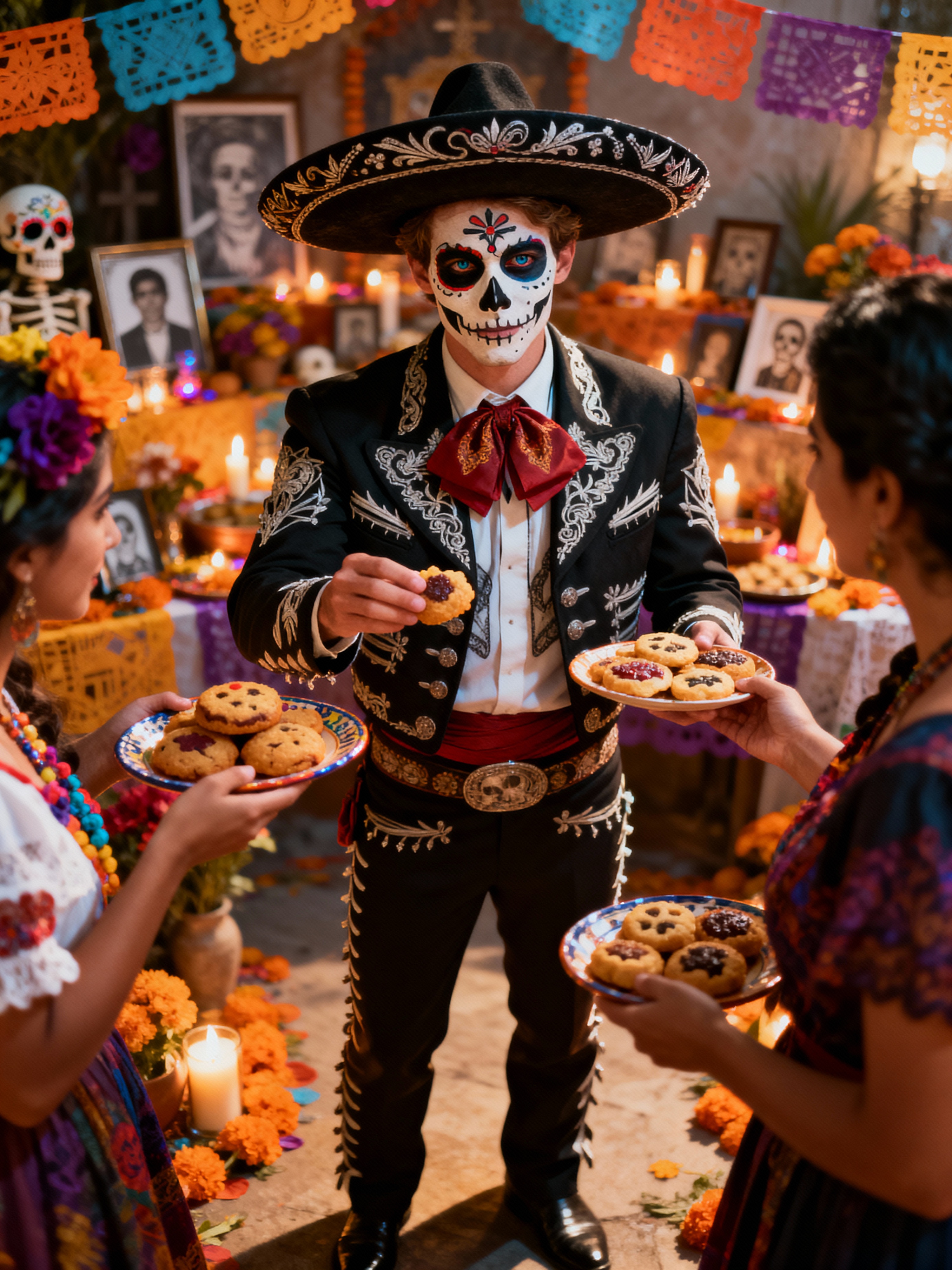 a model in traditional attire during Día de los Muertos, sharing traditional Mexican treats with guests, capturing the celebratory and family-oriented spirit of honoring ancestors
