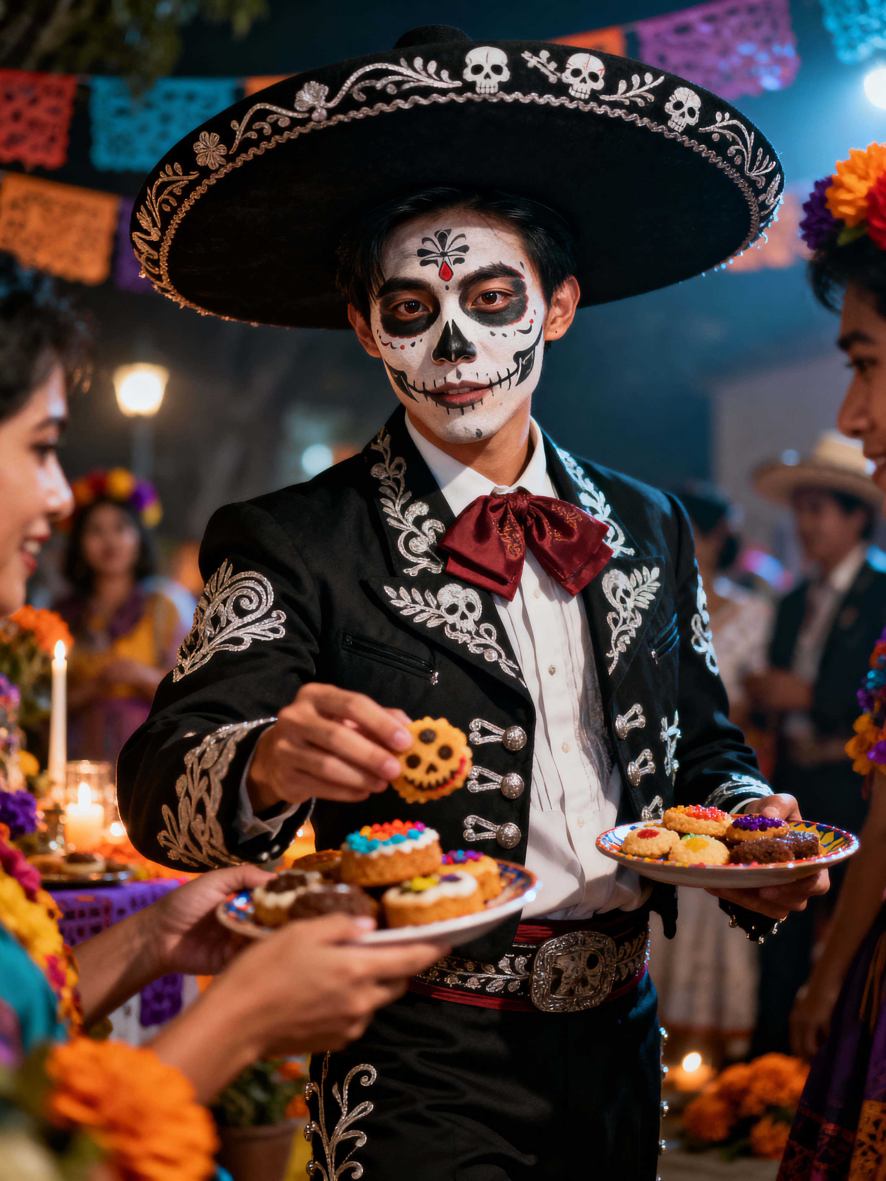 a model in traditional attire during Día de los Muertos, sharing traditional Mexican treats with guests, capturing the celebratory and family-oriented spirit of honoring ancestors