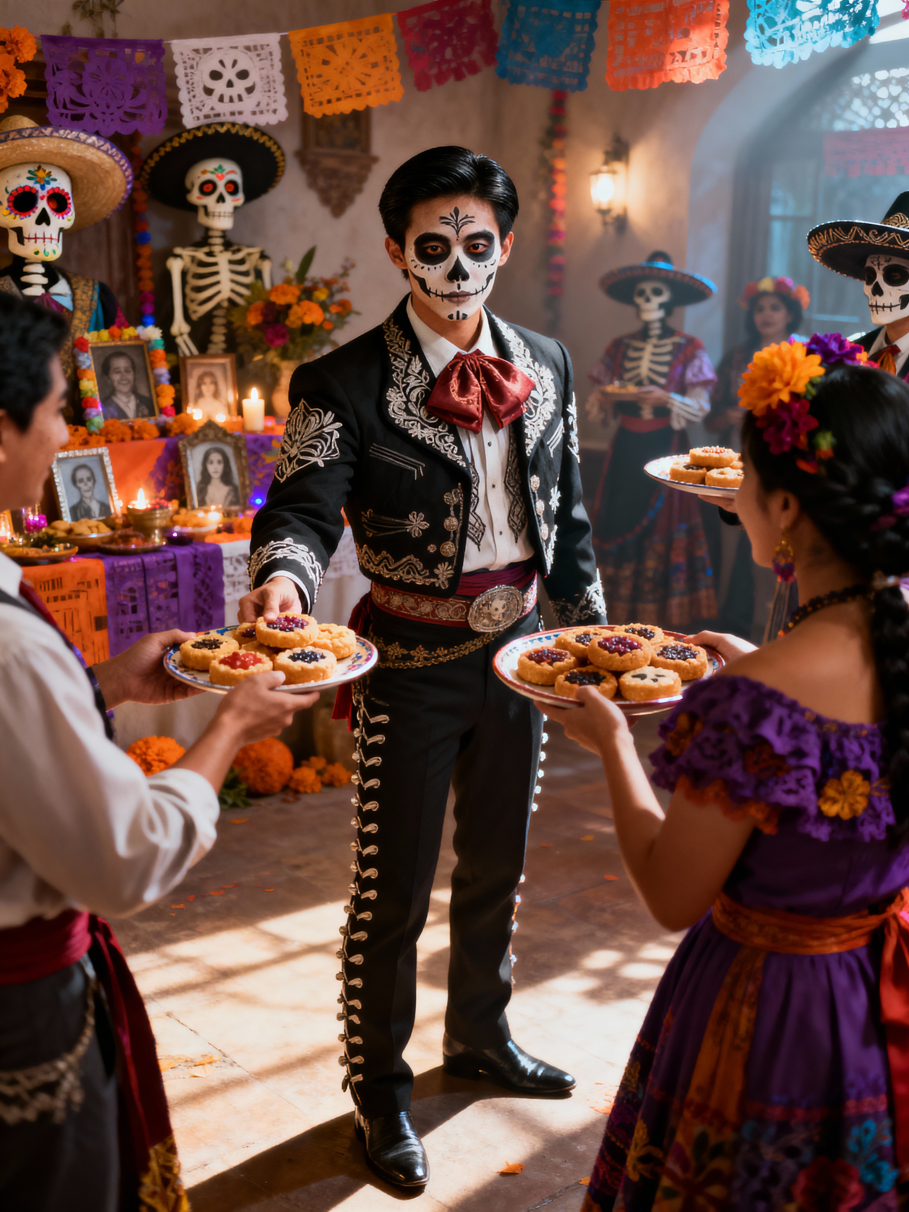 a model in traditional attire during Día de los Muertos, sharing traditional Mexican treats with guests, capturing the celebratory and family-oriented spirit of honoring ancestors