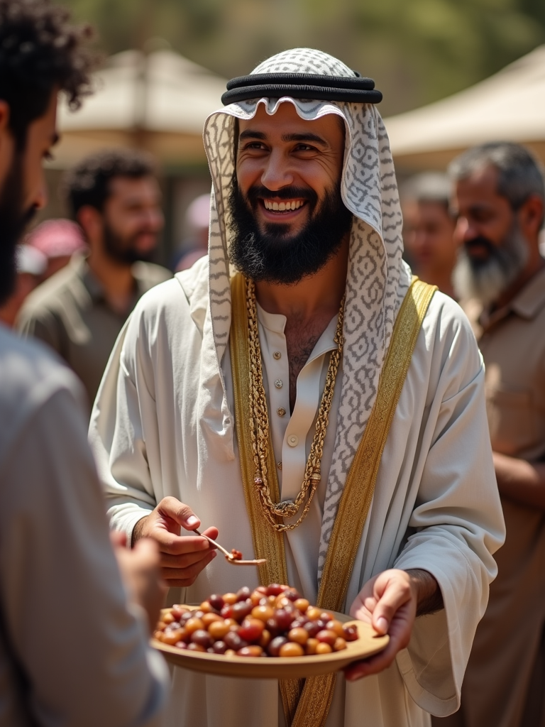 a model in traditional attire during Eid, sharing dates and food with guests, capturing the generous and community spirit of the holiday