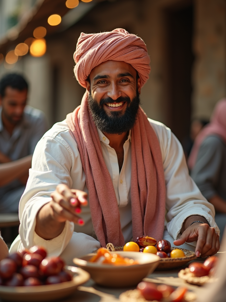 a model in traditional attire during Eid, sharing dates and food with guests, capturing the generous and community spirit of the holiday