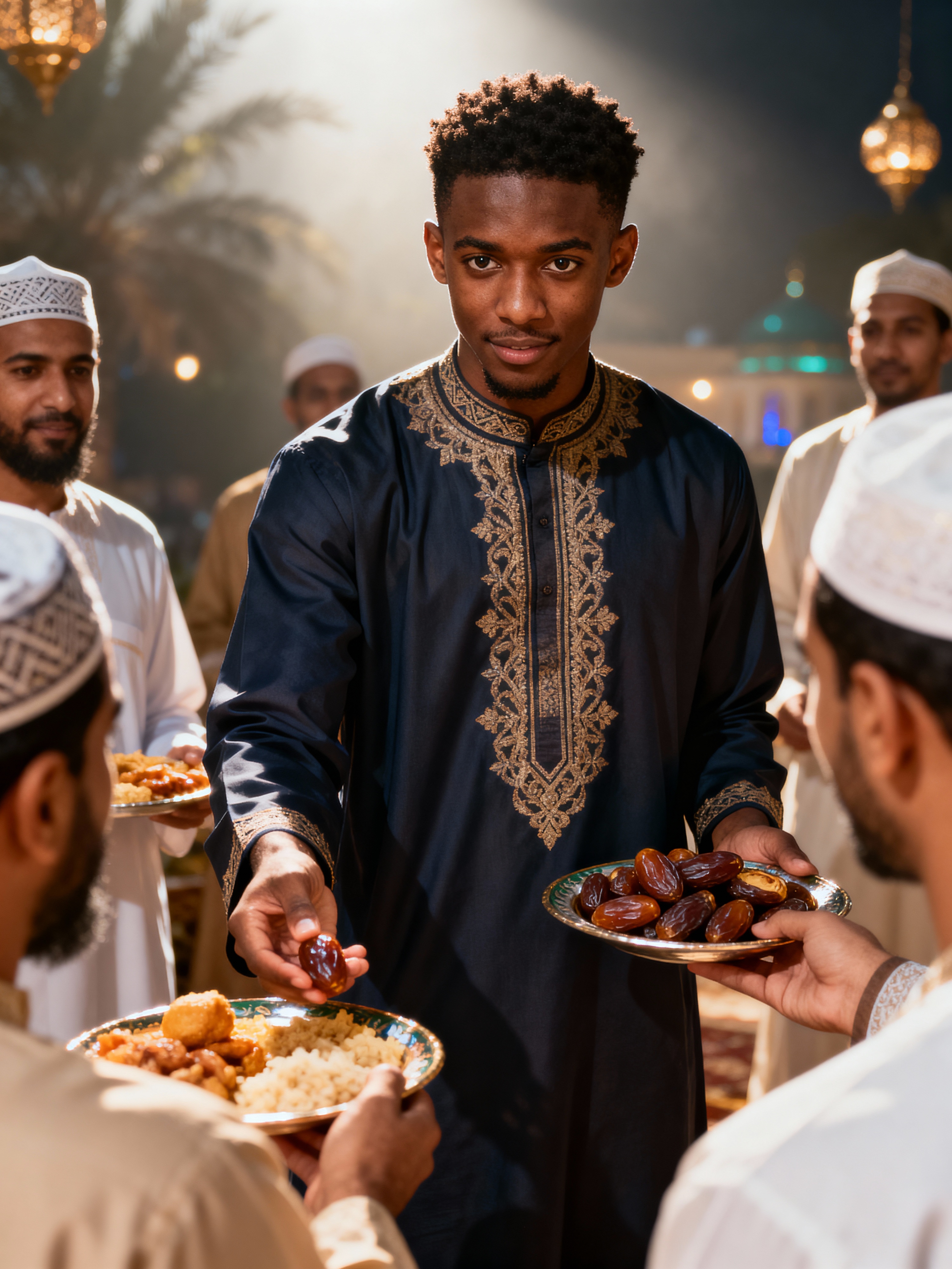 a model in traditional attire during Eid, sharing dates and food with guests, capturing the generous and community spirit of the holiday