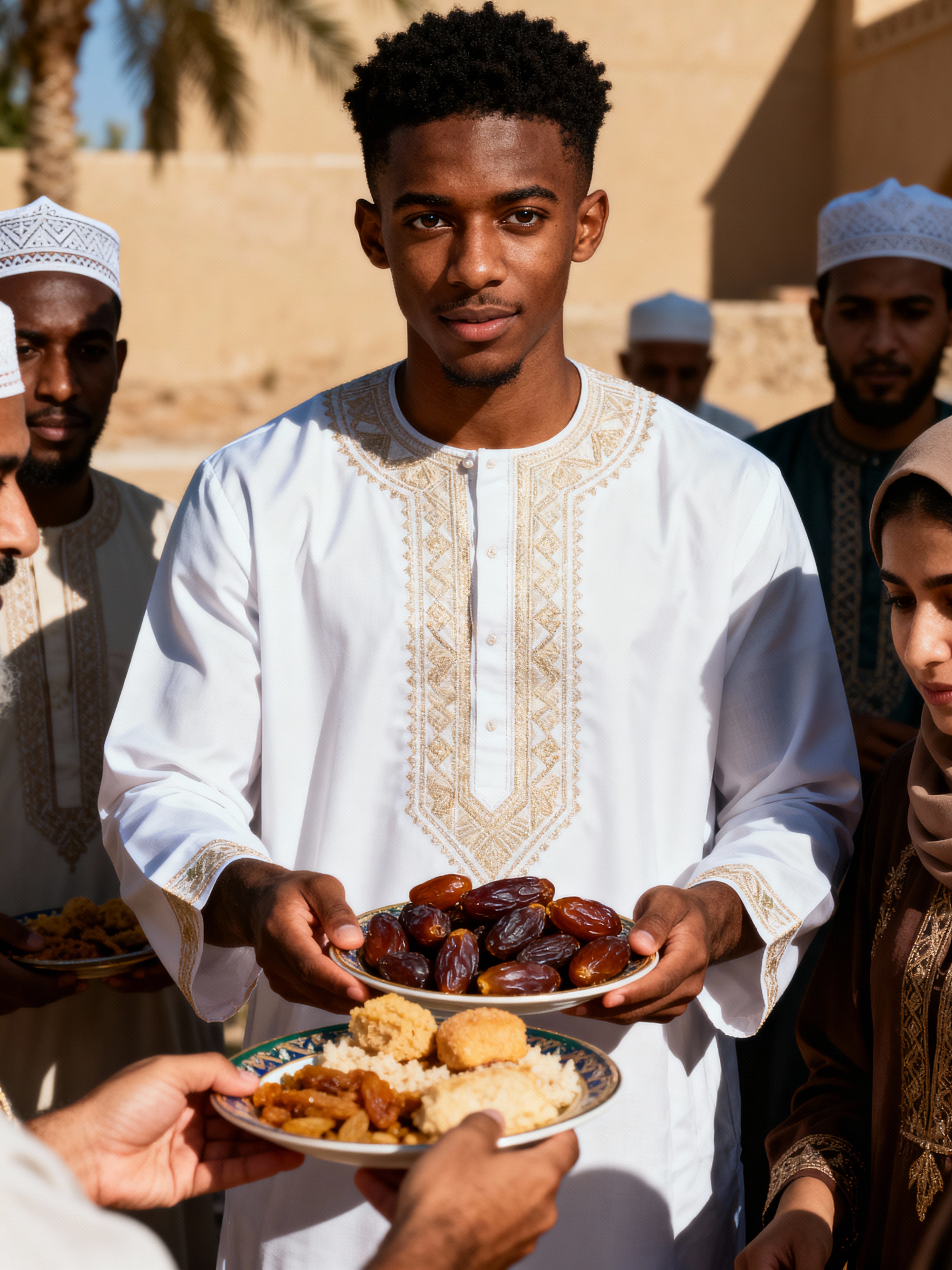 a model in traditional attire during Eid, sharing dates and food with guests, capturing the generous and community spirit of the holiday