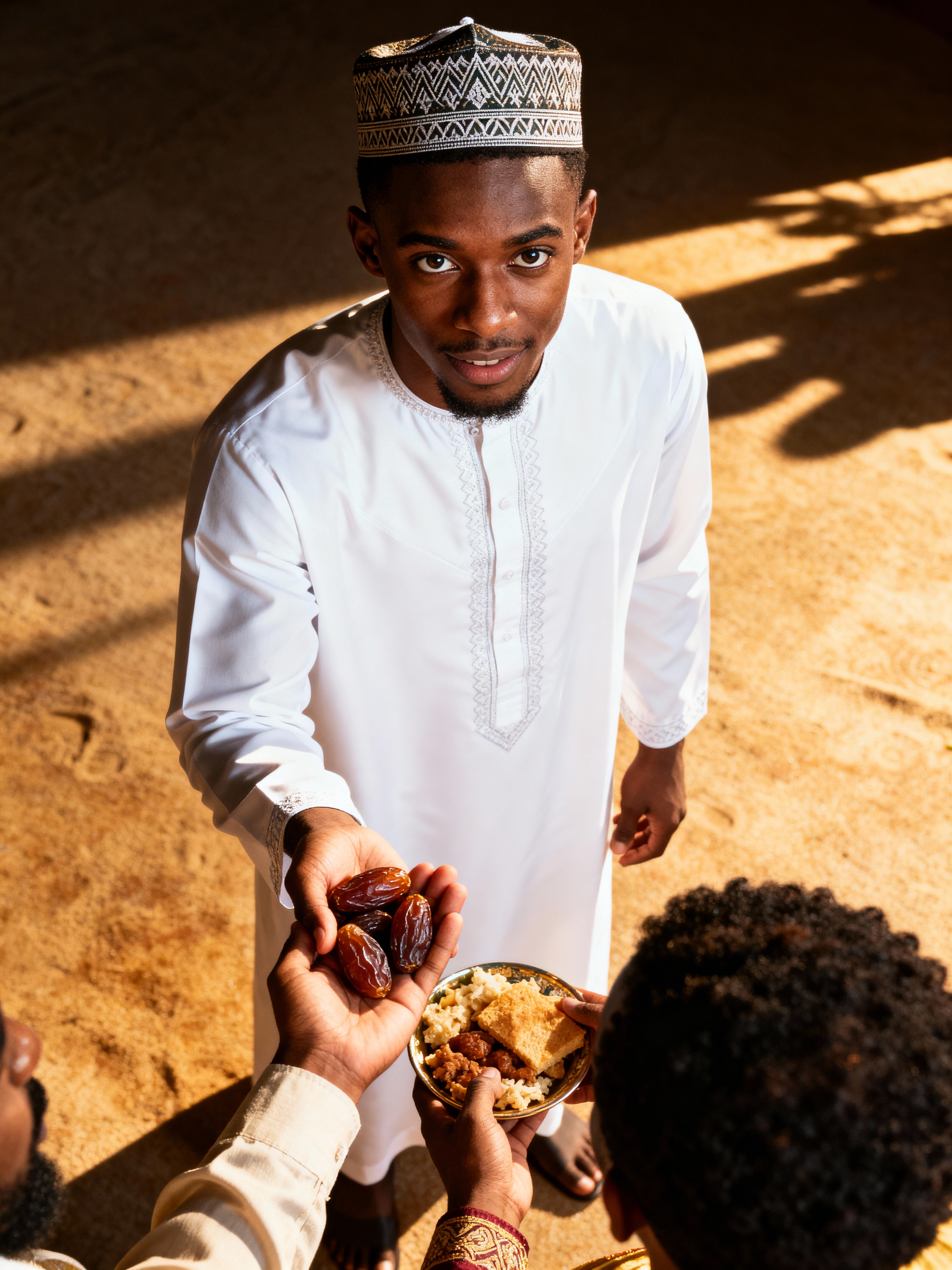 a model in traditional attire during Eid, sharing dates and food with guests, capturing the generous and community spirit of the holiday