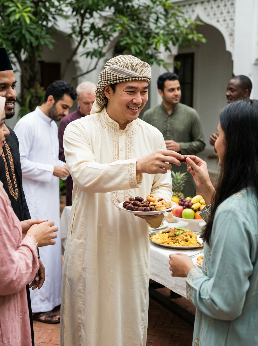 a model in traditional attire during Eid, sharing dates and food with guests, capturing the generous and community spirit of the holiday