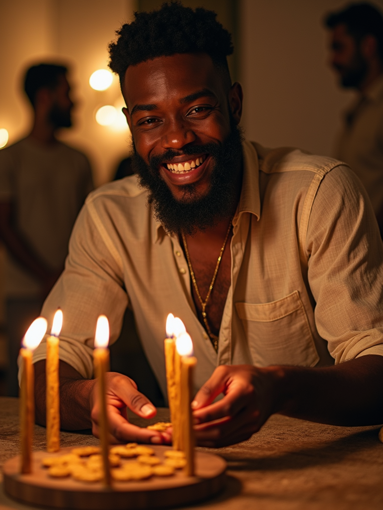 a model in traditional attire during Hanukkah, sharing gelt chocolate coins with guests, capturing the generous and family-oriented spirit of the Festival of Lights