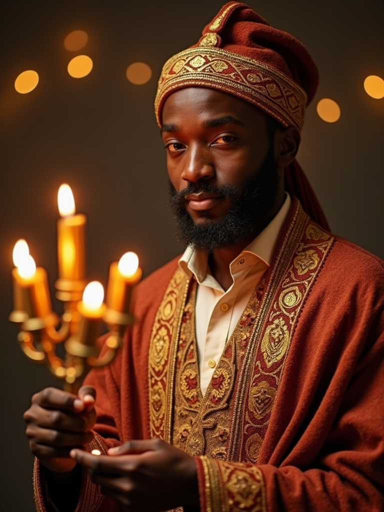 a model in traditional attire during Hanukkah, sharing gelt chocolate coins with guests, capturing the generous and family-oriented spirit of the Festival of Lights
