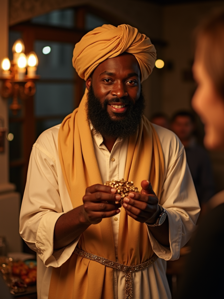 a model in traditional attire during Hanukkah, sharing gelt chocolate coins with guests, capturing the generous and family-oriented spirit of the Festival of Lights