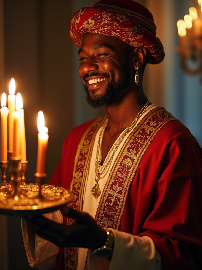 a model in traditional attire during Hanukkah, sharing gelt chocolate coins with guests, capturing the generous and family-oriented spirit of the Festival of Lights