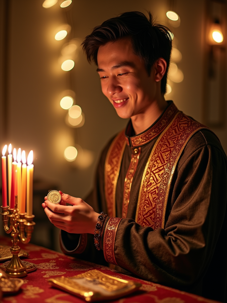 a model in traditional attire during Hanukkah, sharing gelt chocolate coins with guests, capturing the generous and family-oriented spirit of the Festival of Lights
