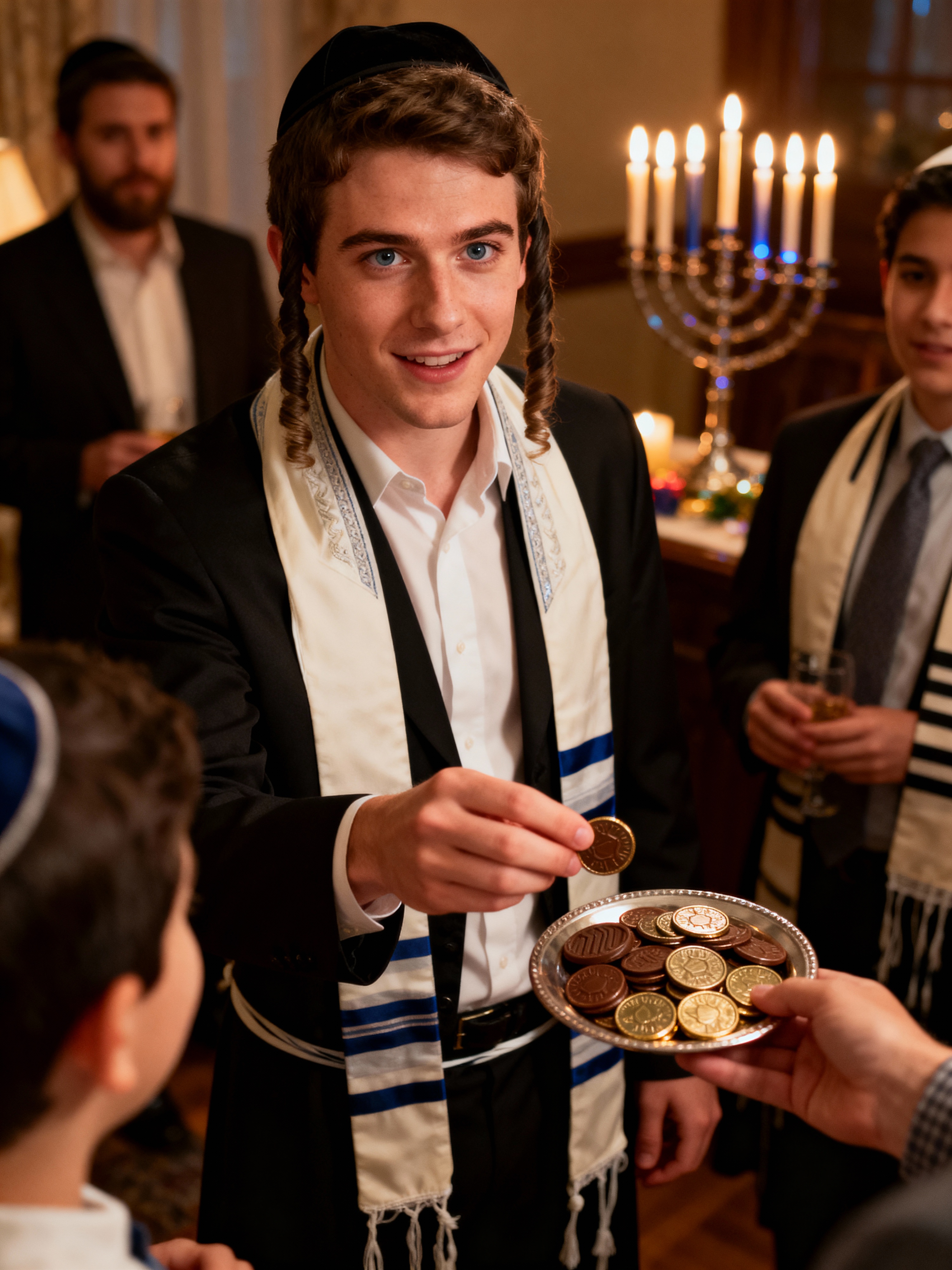 a model in traditional attire during Hanukkah, sharing gelt chocolate coins with guests, capturing the generous and family-oriented spirit of the Festival of Lights