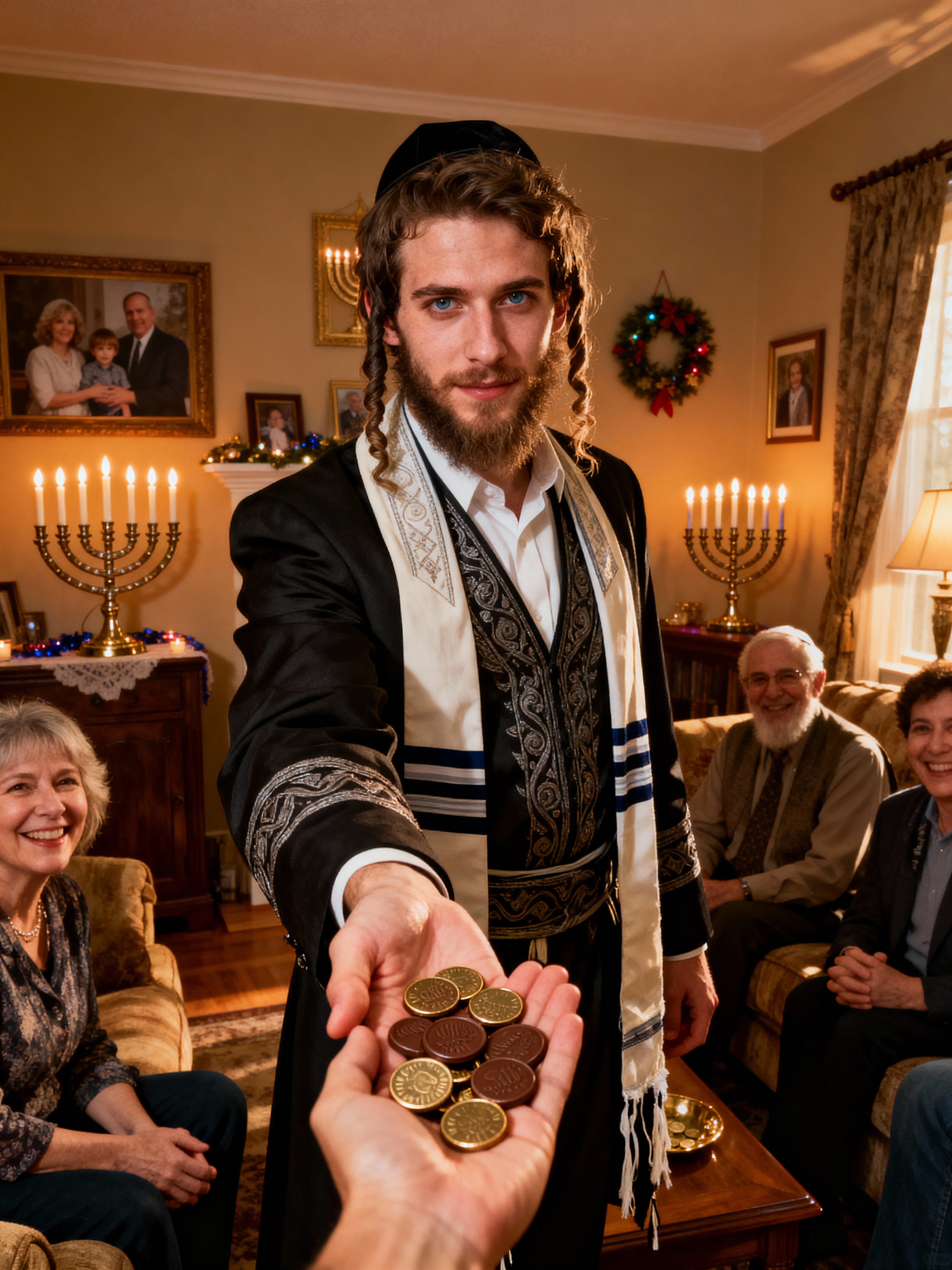 a model in traditional attire during Hanukkah, sharing gelt chocolate coins with guests, capturing the generous and family-oriented spirit of the Festival of Lights