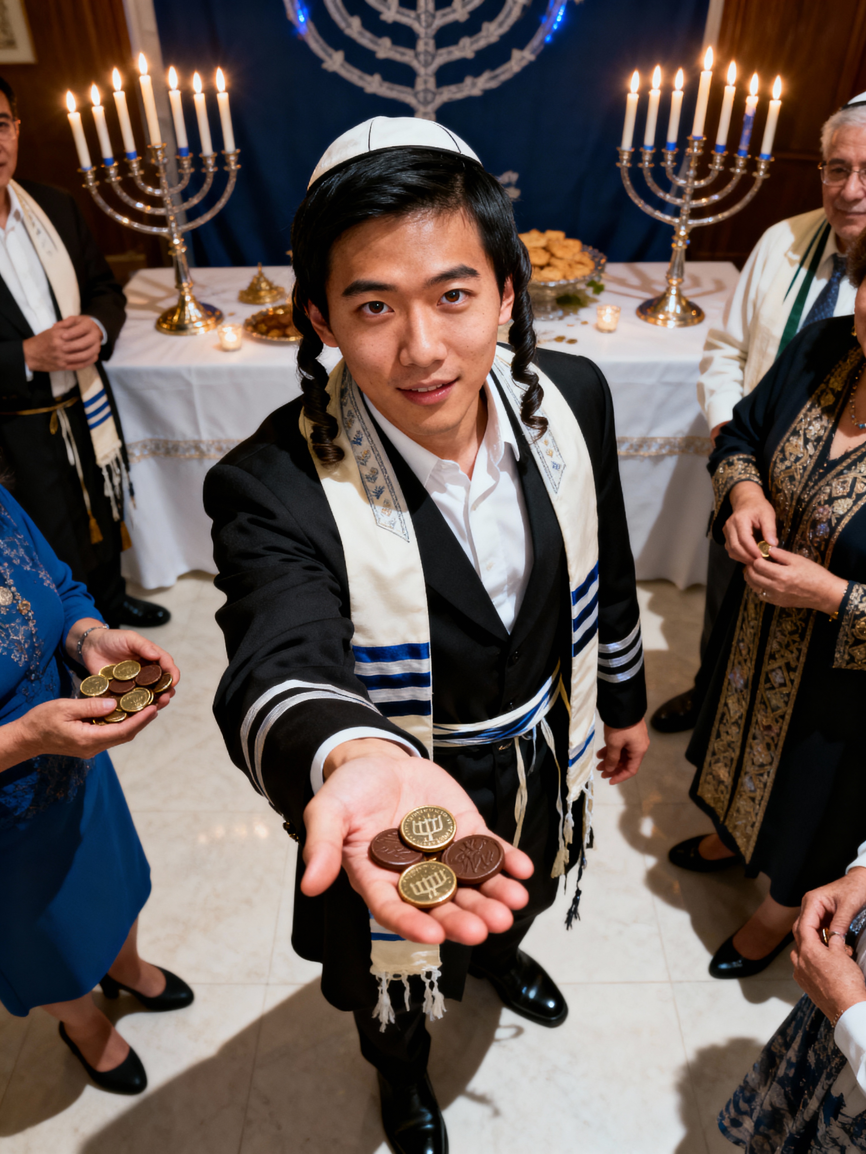 a model in traditional attire during Hanukkah, sharing gelt chocolate coins with guests, capturing the generous and family-oriented spirit of the Festival of Lights