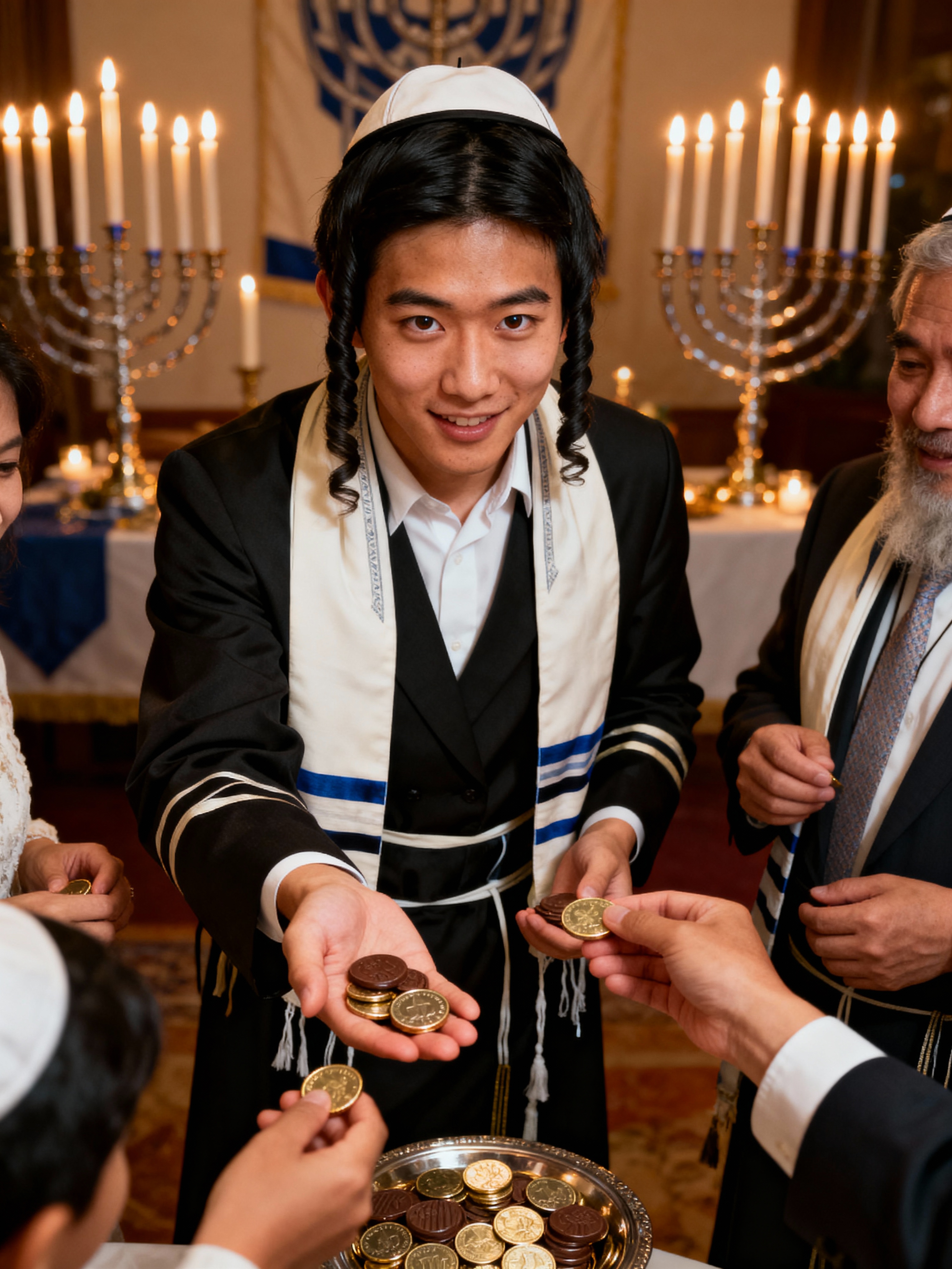 a model in traditional attire during Hanukkah, sharing gelt chocolate coins with guests, capturing the generous and family-oriented spirit of the Festival of Lights