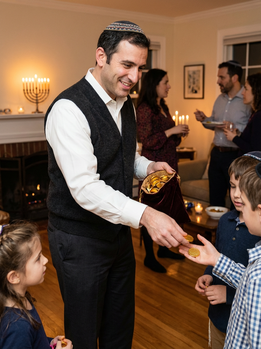 a model in traditional attire during Hanukkah, sharing gelt chocolate coins with guests, capturing the generous and family-oriented spirit of the Festival of Lights