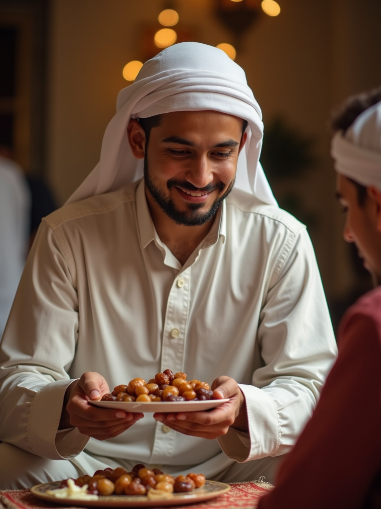 a model in traditional attire during Ramadan, sharing dates and food with guests, capturing the generous and community spirit of the holy month