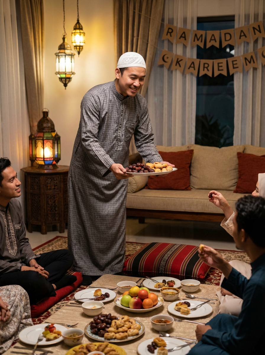 a model in traditional attire during Ramadan, sharing dates and food with guests, capturing the generous and community spirit of the holy month