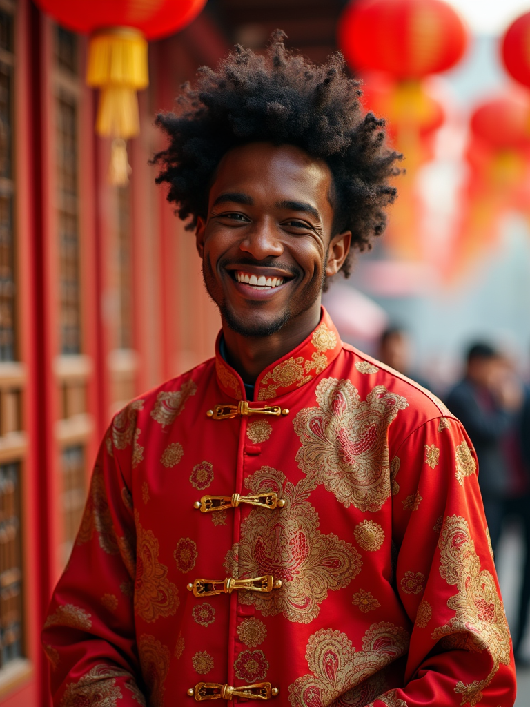 a model in traditional Chinese New Year clothes with symbolic colors, capturing their joyful energy during the Lunar Chinese New Year celebrations, with firecrackers and lion dance decorations