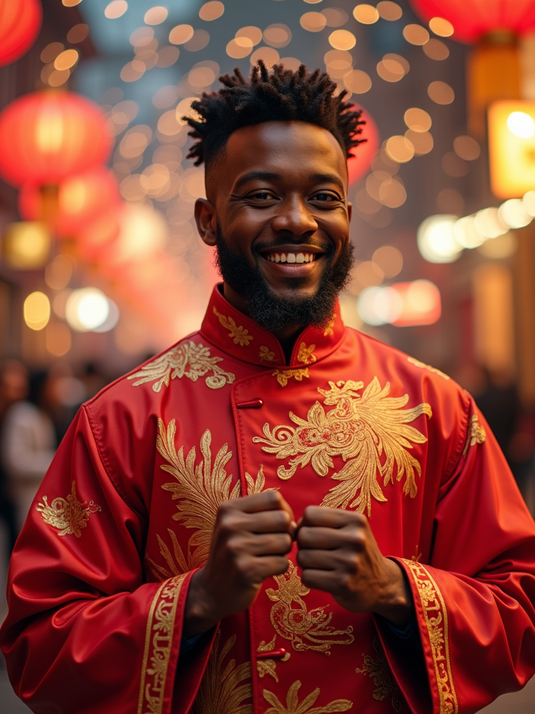 a model in traditional Chinese New Year clothes with symbolic colors, capturing their joyful energy during the Lunar Chinese New Year celebrations, with firecrackers and lion dance decorations