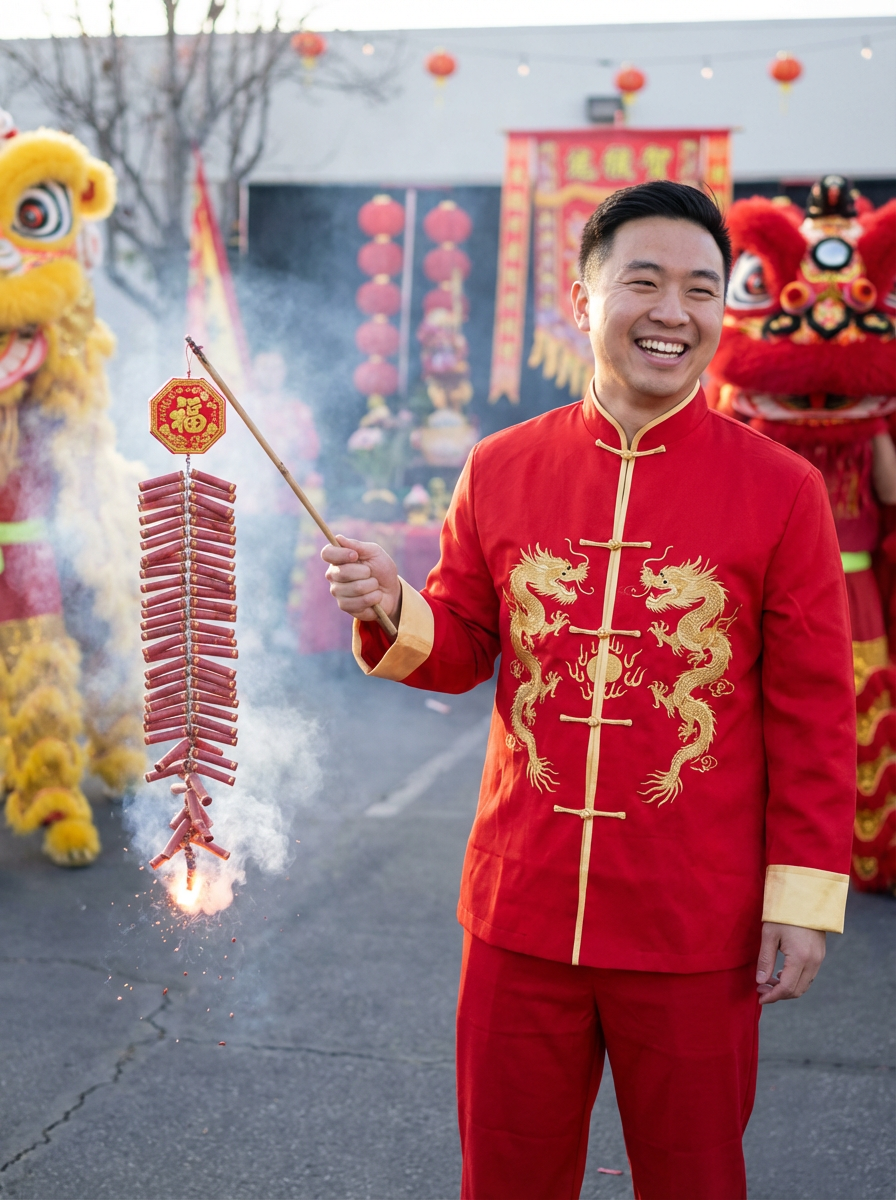 a model in traditional Chinese New Year clothes with symbolic colors, capturing their joyful energy during the Lunar Chinese New Year celebrations, with firecrackers and lion dance decorations