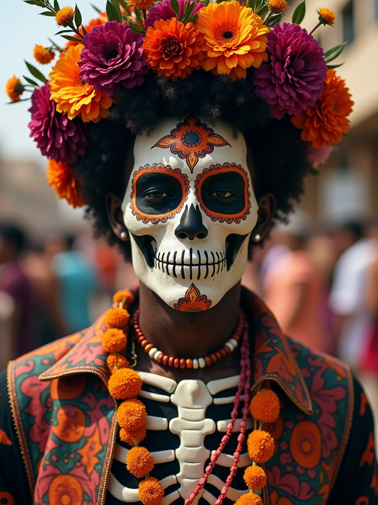 a model in traditional Day of the Dead clothes with skeleton details, capturing their joyful energy during the celebrations, with sugar skulls and marigold decorations