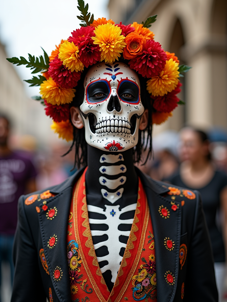 a model in traditional Day of the Dead clothes with skeleton details, capturing their joyful energy during the celebrations, with sugar skulls and marigold decorations