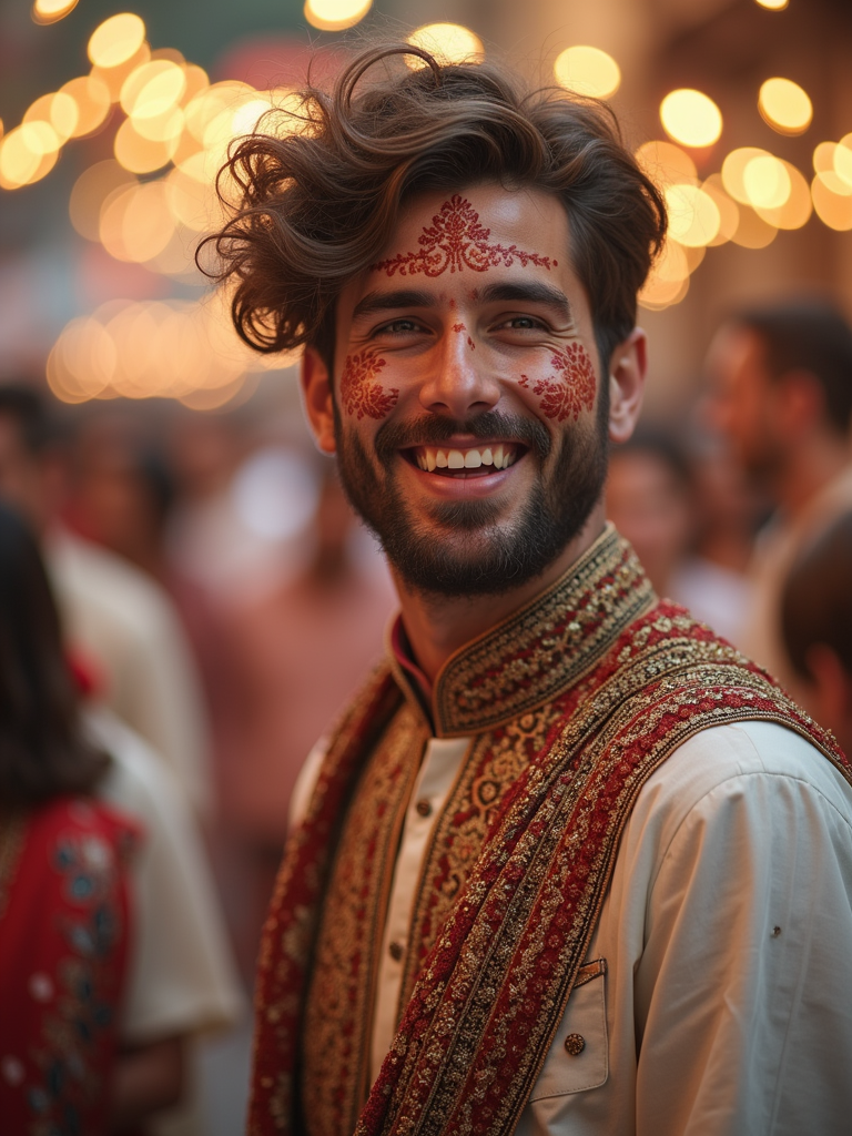 a model in traditional Eid clothes, capturing their joyful energy during the celebrations, with henna designs and festive decorations