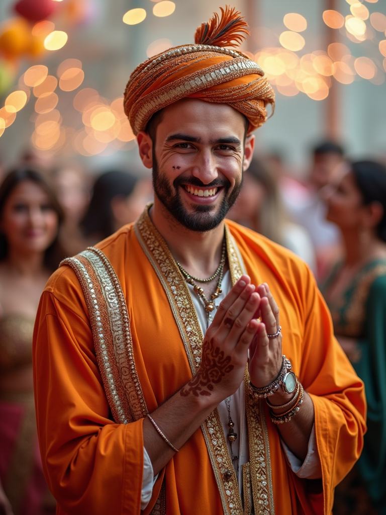 a model in traditional Eid clothes, capturing their joyful energy during the celebrations, with henna designs and festive decorations