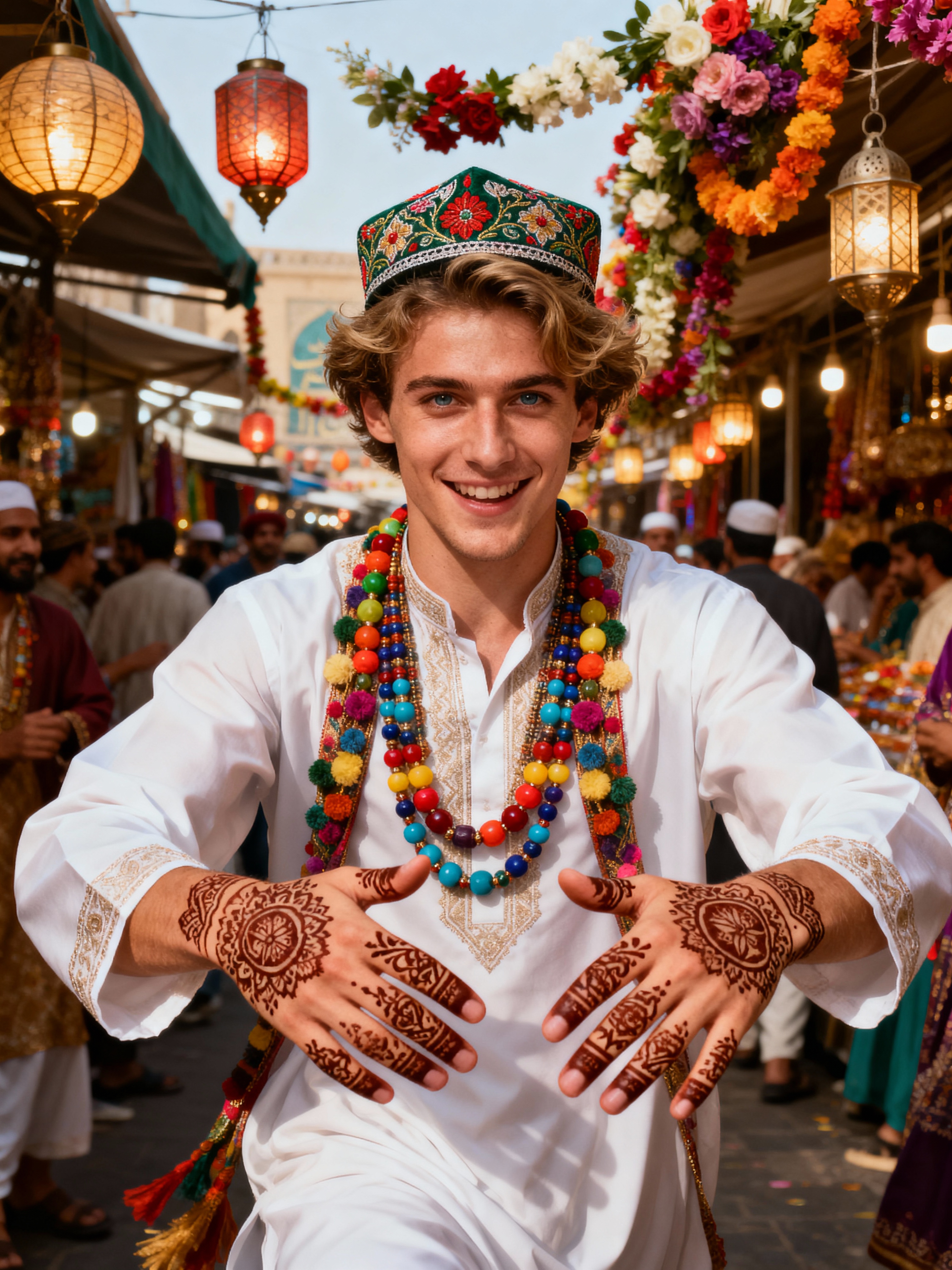 a model in traditional Eid clothes, capturing their joyful energy during the celebrations, with henna designs and festive decorations