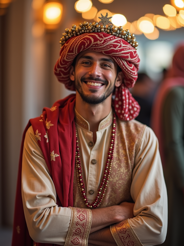 a model in traditional Eid clothes, capturing their joyful energy during the end of Ramadan celebrations, with henna designs and festive decorations