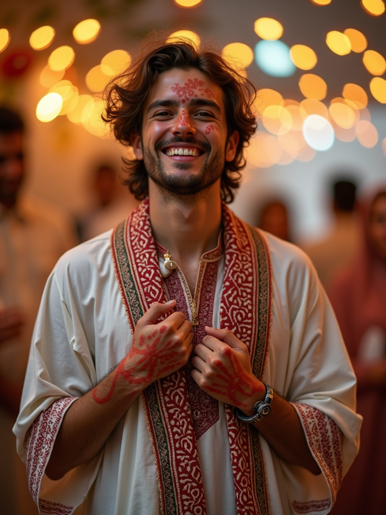 a model in traditional Eid clothes, capturing their joyful energy during the end of Ramadan celebrations, with henna designs and festive decorations