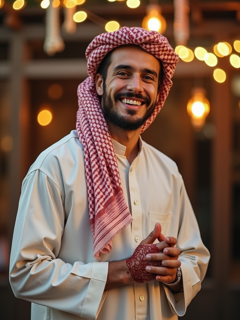 a model in traditional Eid clothes, capturing their joyful energy during the end of Ramadan celebrations, with henna designs and festive decorations