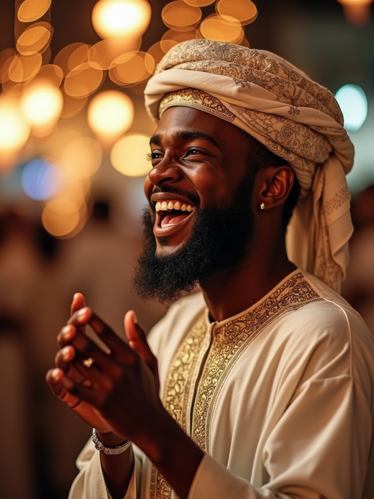 a model in traditional Eid clothes, capturing their joyful energy during the end of Ramadan celebrations, with henna designs and festive decorations