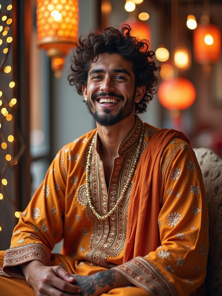 a model in traditional Eid clothes, capturing their joyful energy during the end of Ramadan celebrations, with henna designs and festive decorations