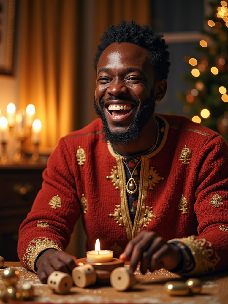 a model in traditional holiday clothes, capturing their joyful energy during Hanukkah celebrations, with dreidels and gelt decorations