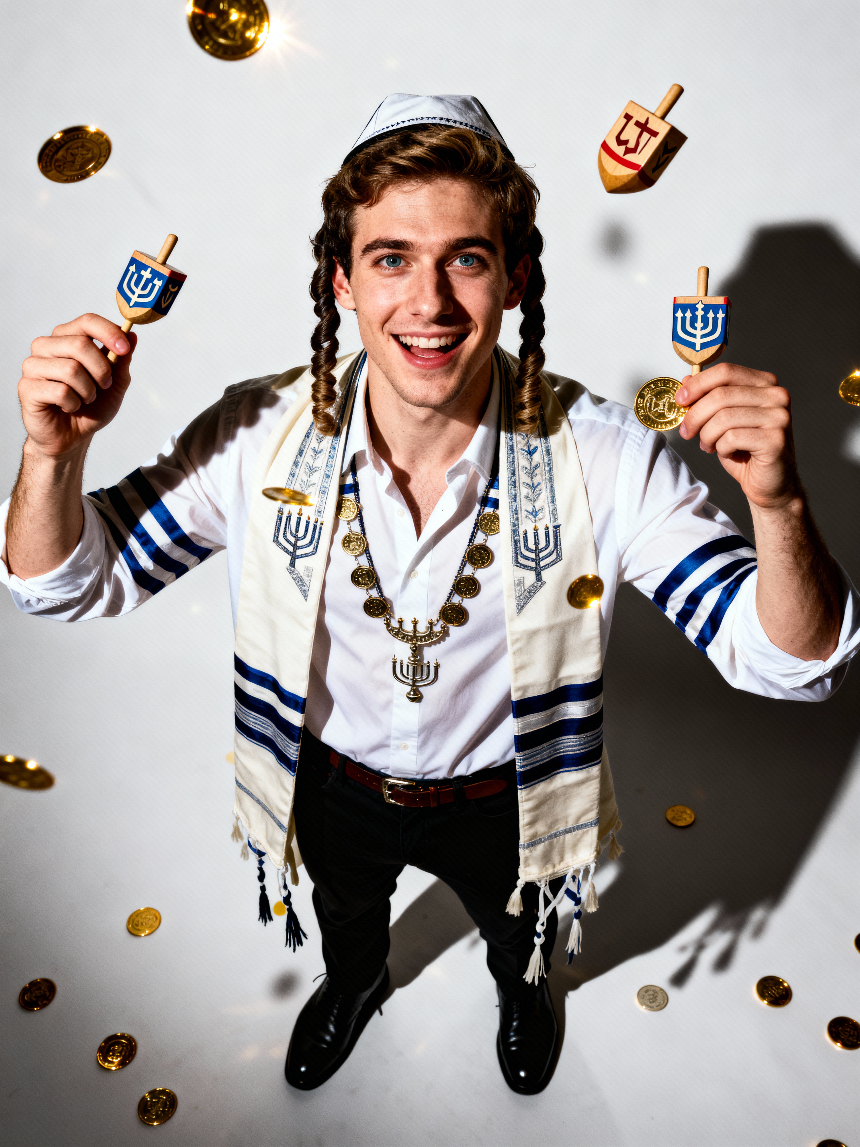 a model in traditional holiday clothes, capturing their joyful energy during Hanukkah celebrations, with dreidels and gelt decorations