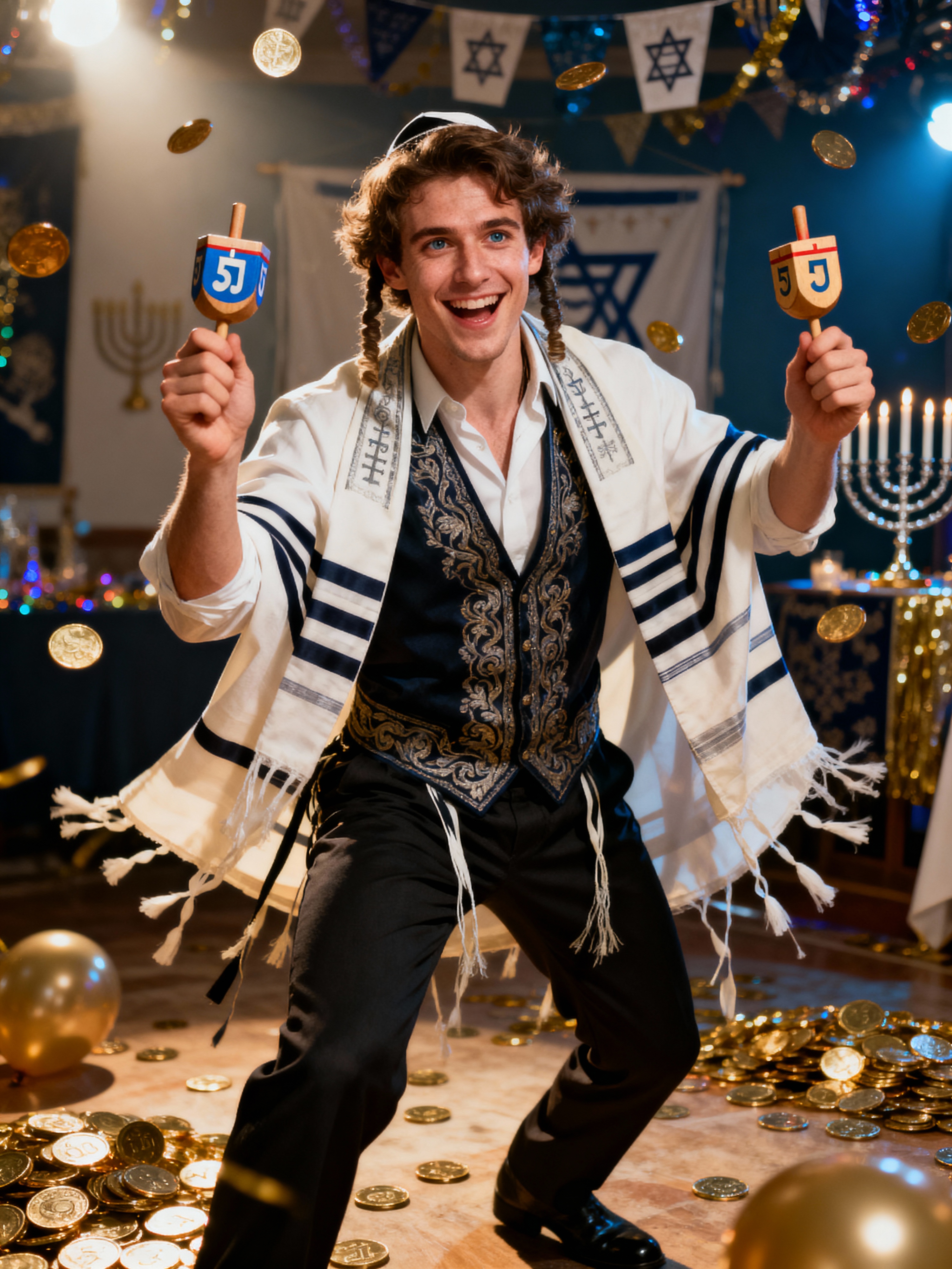 a model in traditional holiday clothes, capturing their joyful energy during Hanukkah celebrations, with dreidels and gelt decorations