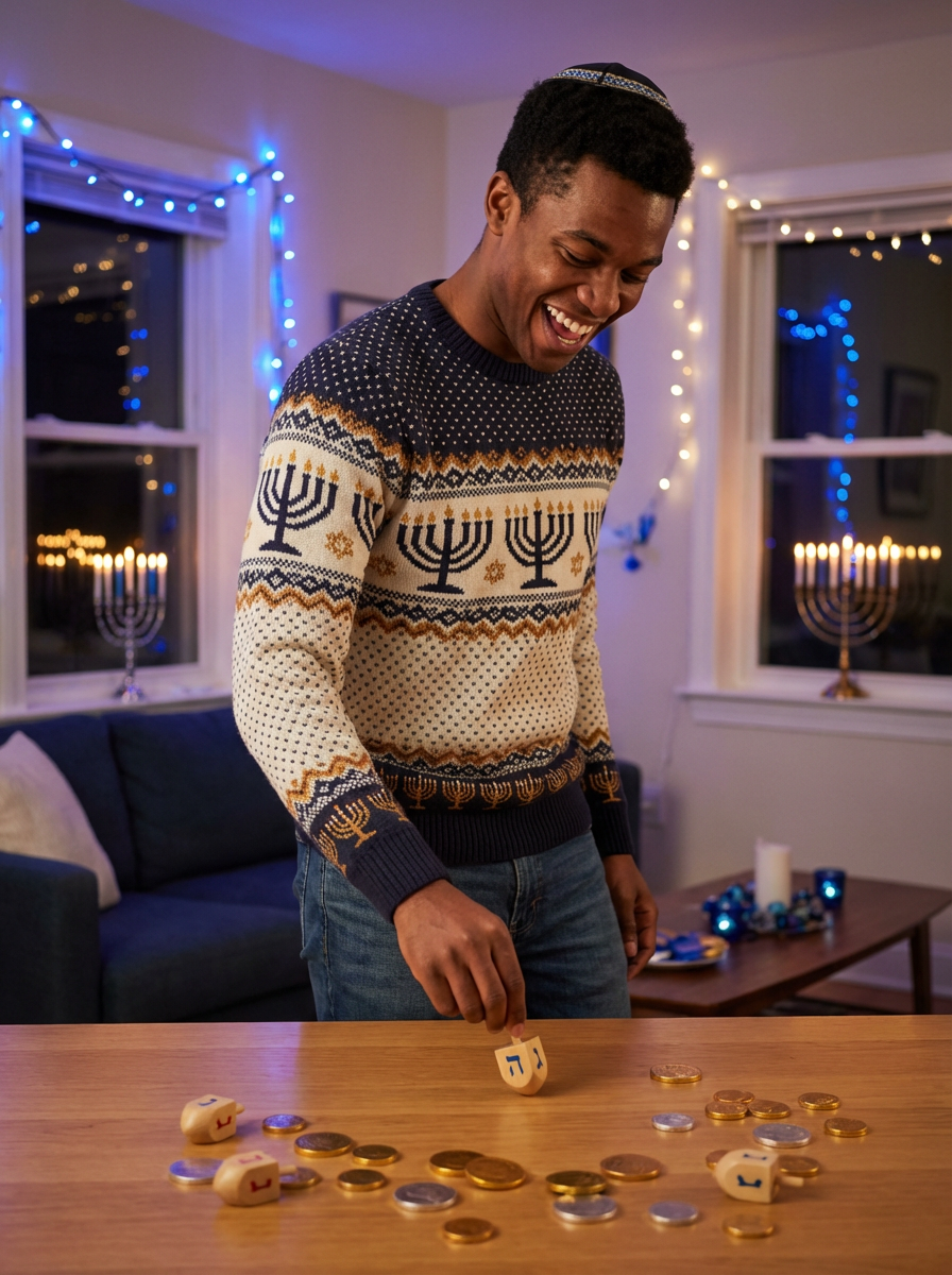 a model in traditional holiday clothes, capturing their joyful energy during Hanukkah celebrations, with dreidels and gelt decorations