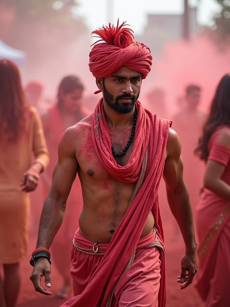 a model in traditional Indian attire splashed with Holi colors, dancing with fellow festival participants, capturing the energetic and playful atmosphere of the festival