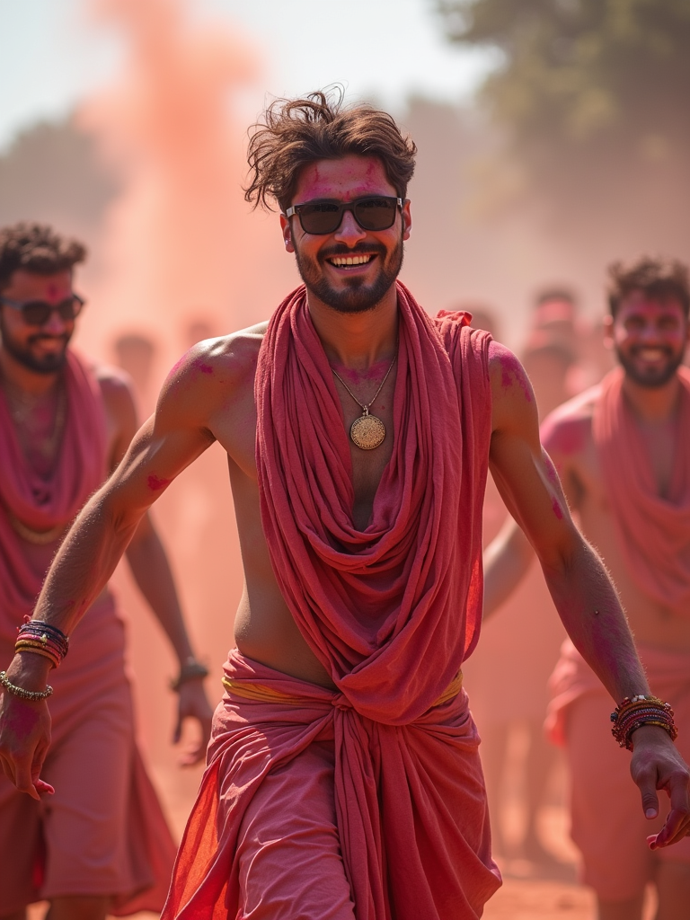 a model in traditional Indian attire splashed with Holi colors, dancing with fellow festival participants, capturing the energetic and playful atmosphere of the festival