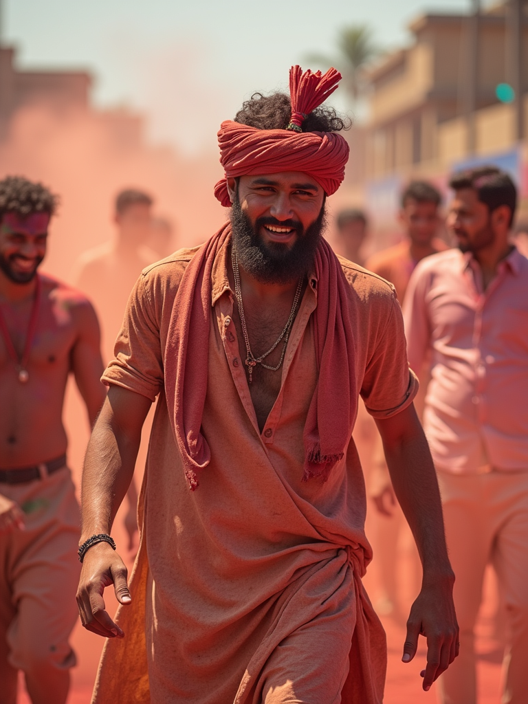 a model in traditional Indian attire splashed with Holi colors, dancing with fellow festival participants, capturing the energetic and playful atmosphere of the festival